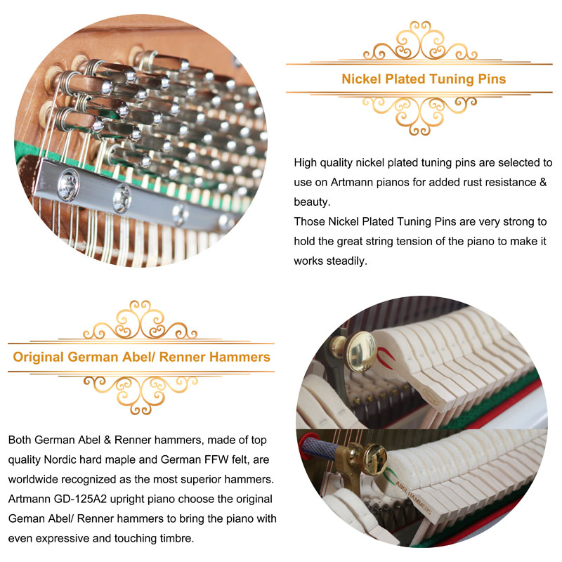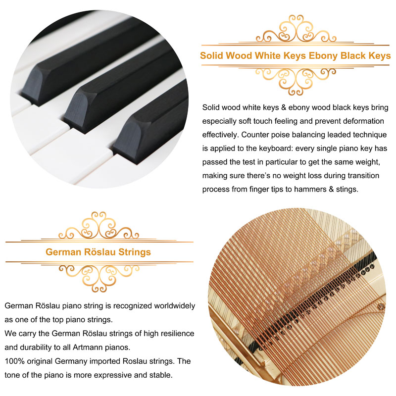 New masterpiece of German master, the embedded wood grain makes the pianos to be more noble and magnificent. The pure and fresh timbre, soft touching feeling, unique design and also the strict selection of the material contribute to its everlasting classic.