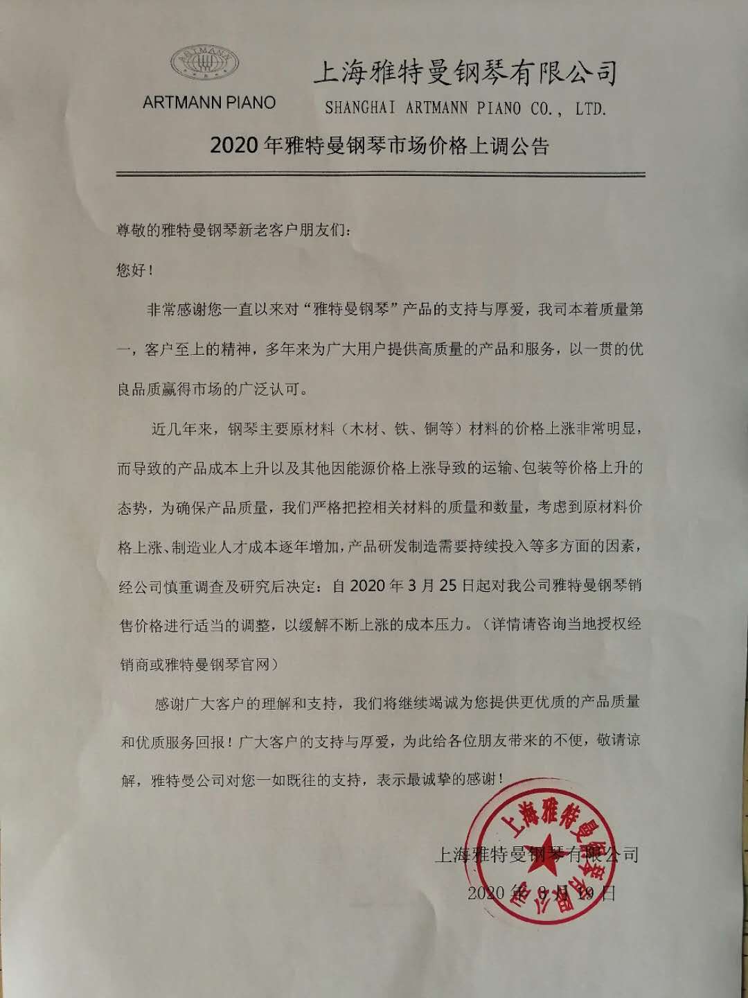 2020年雅特曼钢琴调价公告