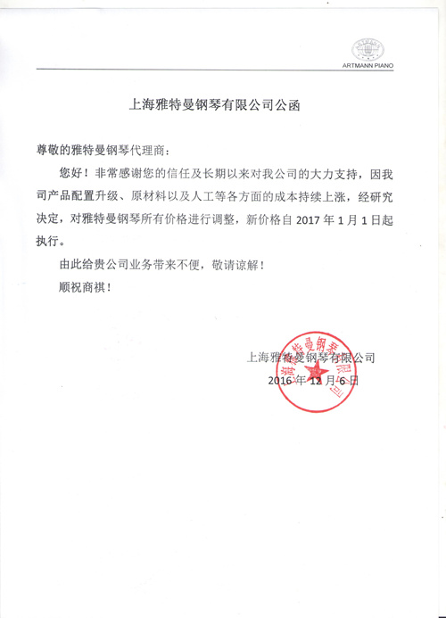 Shanghai Artmann Piano Co., Ltd Official Letter of Price Adjustment